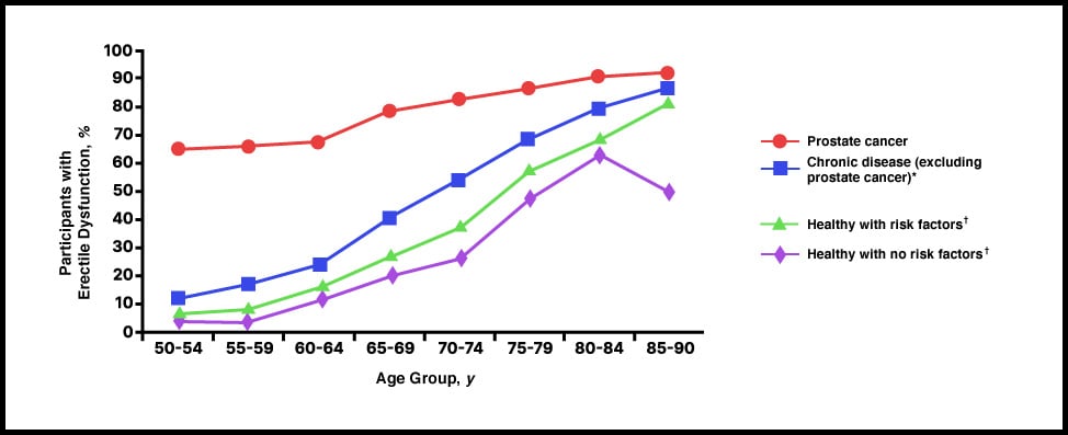 The single biggest factor associated with ED is aging. Men are at higher risk as they get older (see chart below). Having any of the following can elevate ED risk: