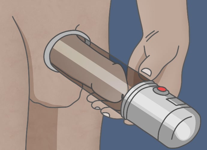 A vacuum erection device, or penis pump, may be helpful for patients who have only partial erections or who don't respond to or want to use other treatments. The device consists of a plastic cylinder connected to a pump and a constriction ring. Either manual or battery power is used to create suction around the penis and draw blood into it; the constriction ring is then released around the base of the penis to keep blood in the penis and maintain the erection. The device may be used safely for up to 30 minutes, at which point the constriction ring should be removed. The advantages of such a device are that it's relatively inexpensive and easy to use and there's no concerns about drug side effects or interactions. Possible side effects of the device include temporary penile numbness, bruising, and semen trapped by the ring. Some patients also report that the erection they obtain with the device feels somewhat artificial.